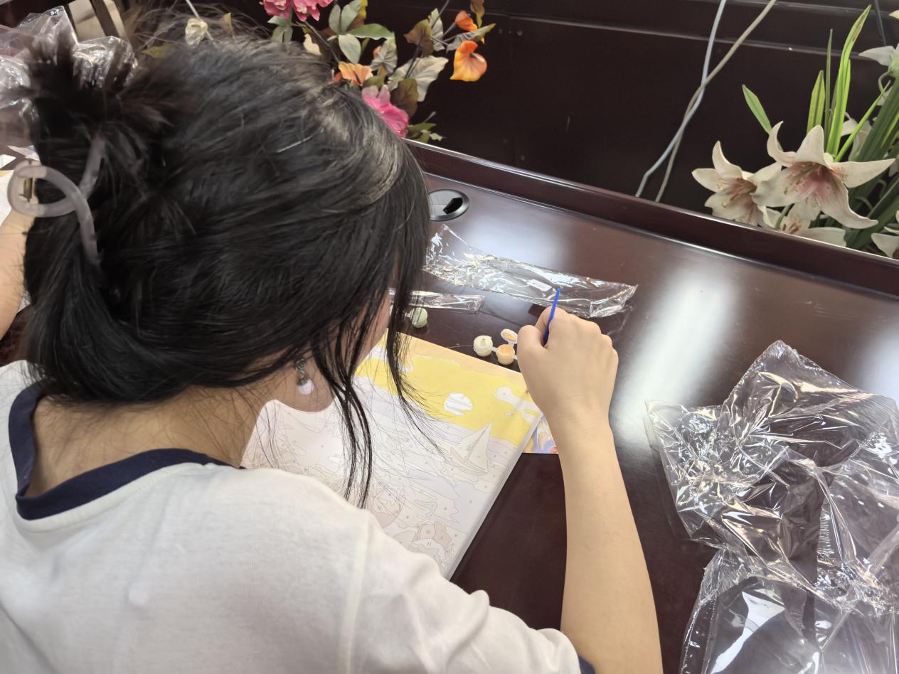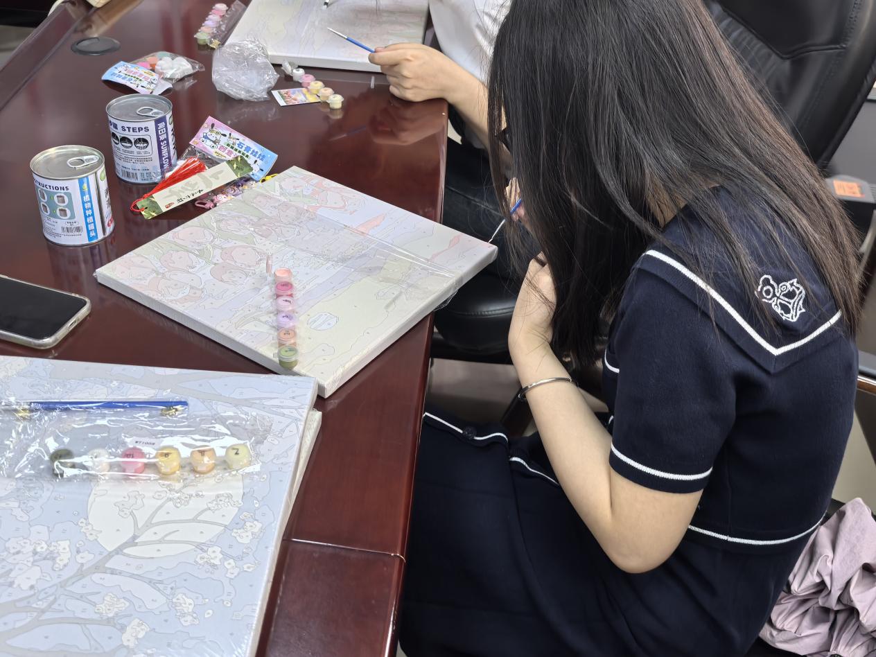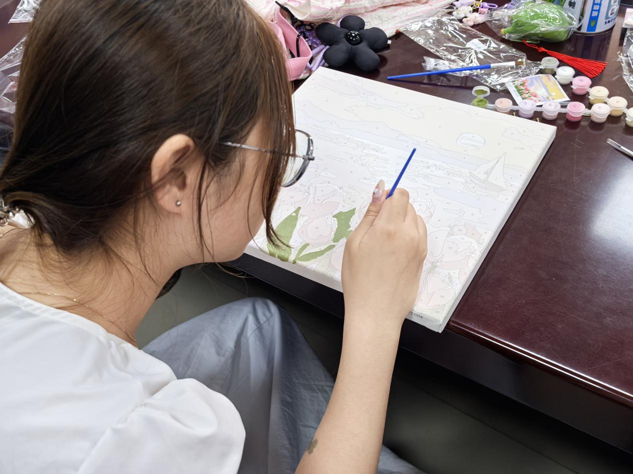 活动现场,刘周玉同学带领参与者以“情绪表达”为核心,通过线条勾勒与色彩碰撞释放内心压力。从挑选颜料到涂抹画布,同学们在舒缓的背景音乐中专注创作,将论文写作的焦虑、浮躁生活的不安转化为笔下的抽象图案或具象场景。不少参与者表示,“第一次尝试无拘无束的涂鸦,没想到颜料混合的过程就像情绪被慢慢调和,整个人放松了很多。”