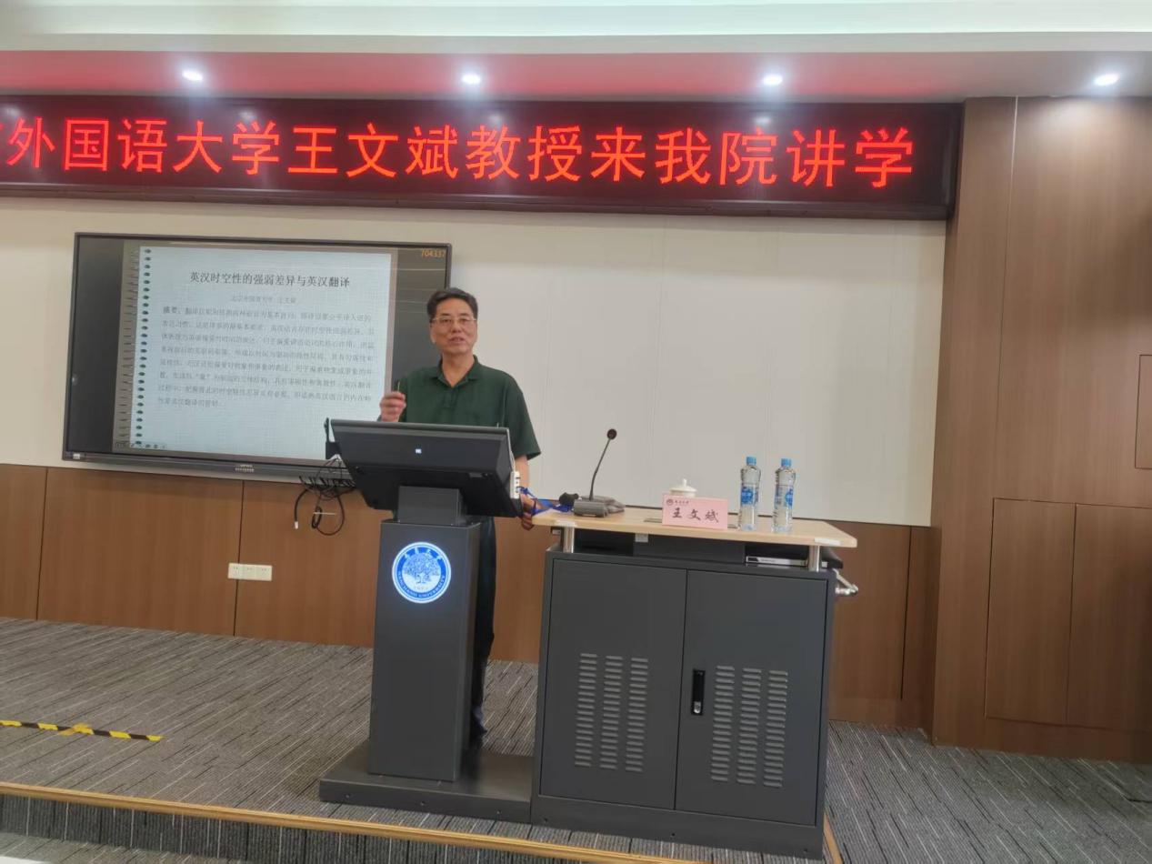 2025年6月20日上午,北京外国语大学王文斌教授应我院邀请,在外经楼402作题为“英汉时空性的强弱差异与英汉翻译”的专题讲座。讲座由蒋平教授主持,学院相关研究领域教师、研究生到场聆听