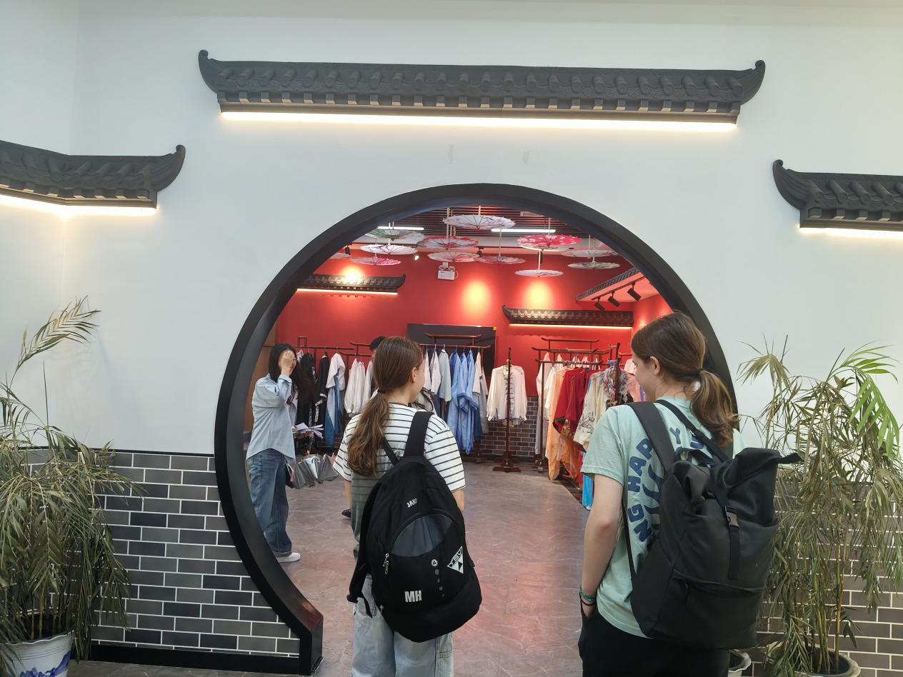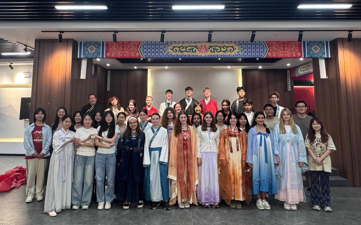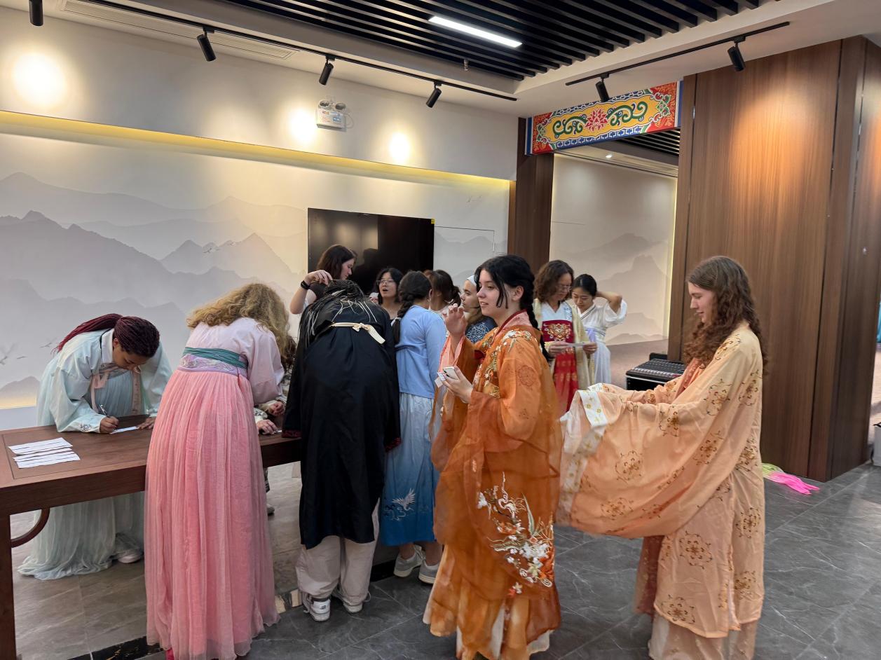 随后,众人移步至国际教育学院的汉服体验馆,开启中华文化沉浸式体验之旅。我校师生化身 “文化使者”,从汉服的款式分类到审美观念,进行了细致入微的讲解。在他们的帮助下,德国学生身着精美汉服,衣袂飘飘间感受千年服饰文化的魅力。现场,大家纷纷拍照留念,镜头定格下大家对中华文化的赞叹与喜爱。