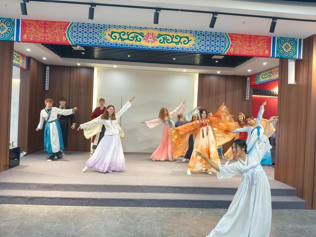 古典舞《初见》的体验将活动氛围推向高潮。德语241班胡顺杰同学手持绸扇,将古典元素巧妙融入舞步之中,以轻盈优美的舞姿展现中国古典舞的独特韵味。德国学生们兴致勃勃地跟随学习,从手势到步伐,从眼神到神态,努力体会着传统艺术的精妙之处。现场音乐悠扬,文化交流的欢乐氛围感染着在场的每一个人。