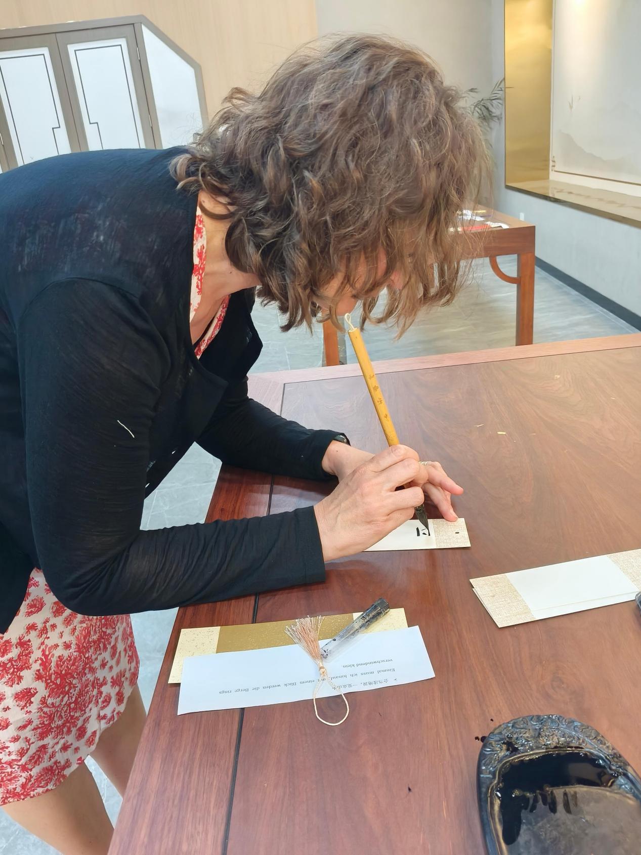 在自制书签活动中,中德学子两两合作,共同创作。德语241班李嘉旭同学,凭借其扎实的书法功底和对汉学文化的深刻理解,耐心地为德国伙伴传授书写技巧。从简单的笔画开始,逐步深入,最终共同书写出寓意美好的汉字,每一个字都凝聚着双方的智慧与努力。德国友人在活动中表现出了极高的专注度和热情,在李嘉旭同学的指导下,一笔一划地书写着“平安”签。在书写过程中,德国友人不仅学习到了汉字的书写技巧,更通过这些笔画感受到了汉字背后所蕴含的深厚文化底蕴。而中方学子也在与德国友人的交流中,从不同的视角重新审视自己的文化,进一步加深了对中华文化的认同与自豪。