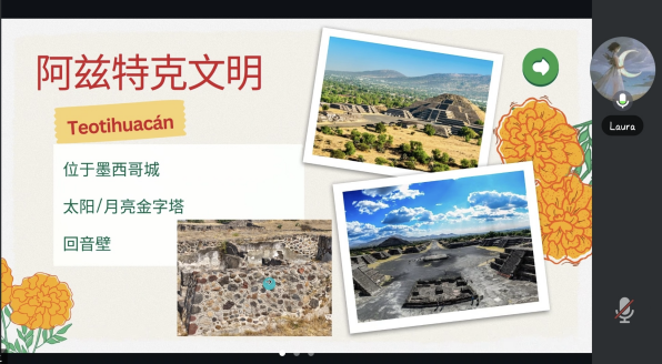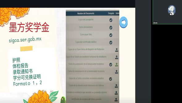 分享会伊始,西语221班的黄安琪、赖婧婧和汤诗玥同学分享了在墨西哥奇瓦瓦自治大学的留学经历。2024年9月,三位同学经过选拔,获得国家留学基金委墨西哥政府互换奖学金赴墨开展为期一年的留学。她们从项目申请流程、中墨文化差异以及当地风土人情三个方面,生动展现了墨西哥留学的独特魅力。