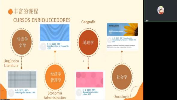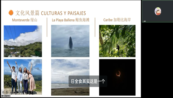 随后,西语211班的江厦雯同学讲述了她在哥斯达黎加大学的留学体验。同样得益于国家留学基金委的奖学金支持,她于2023年来到这个美丽的中美洲国家。江同学围绕留学申请、住宿安排、学习生活及学分互换规则等话题提供了详实的建议,并特别提醒大家提前做好学业规划,确保留学期间的学习顺利衔接。