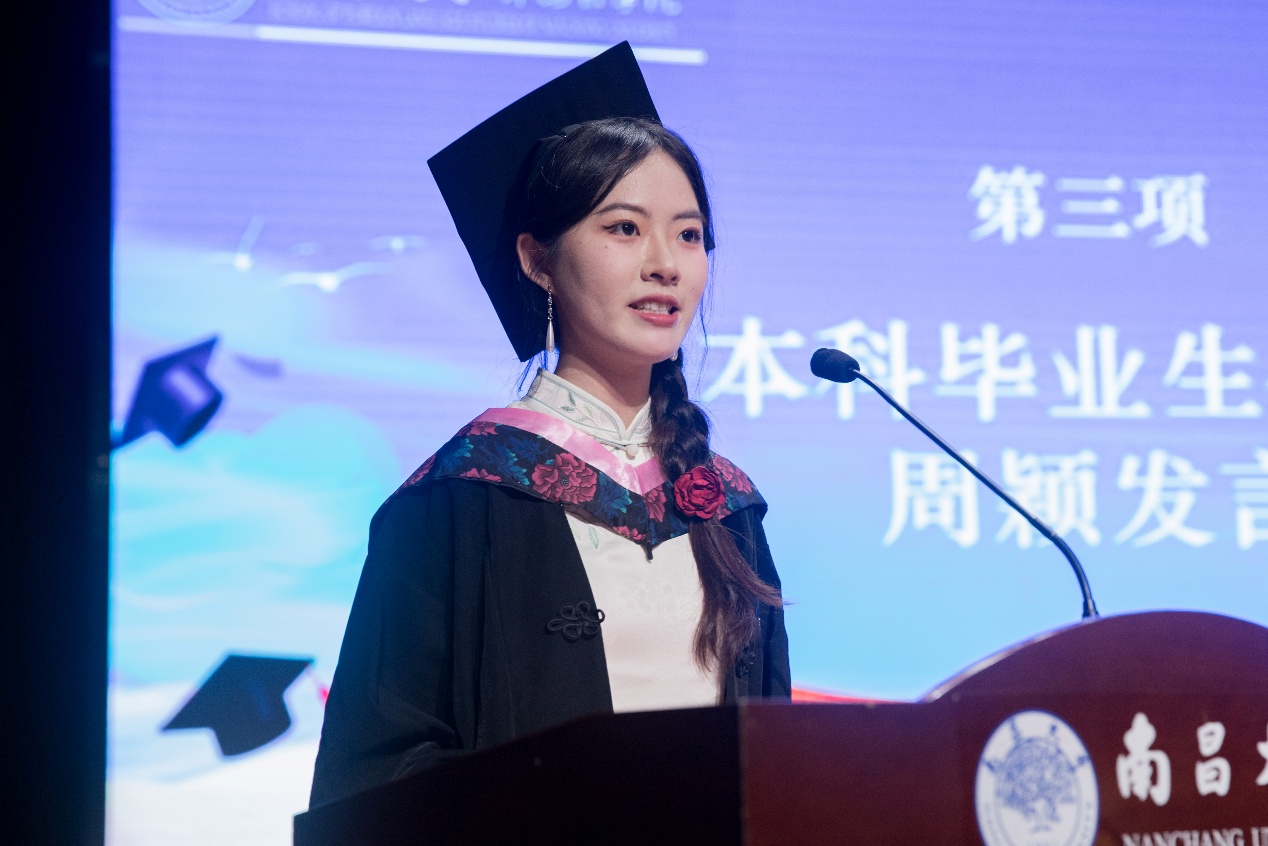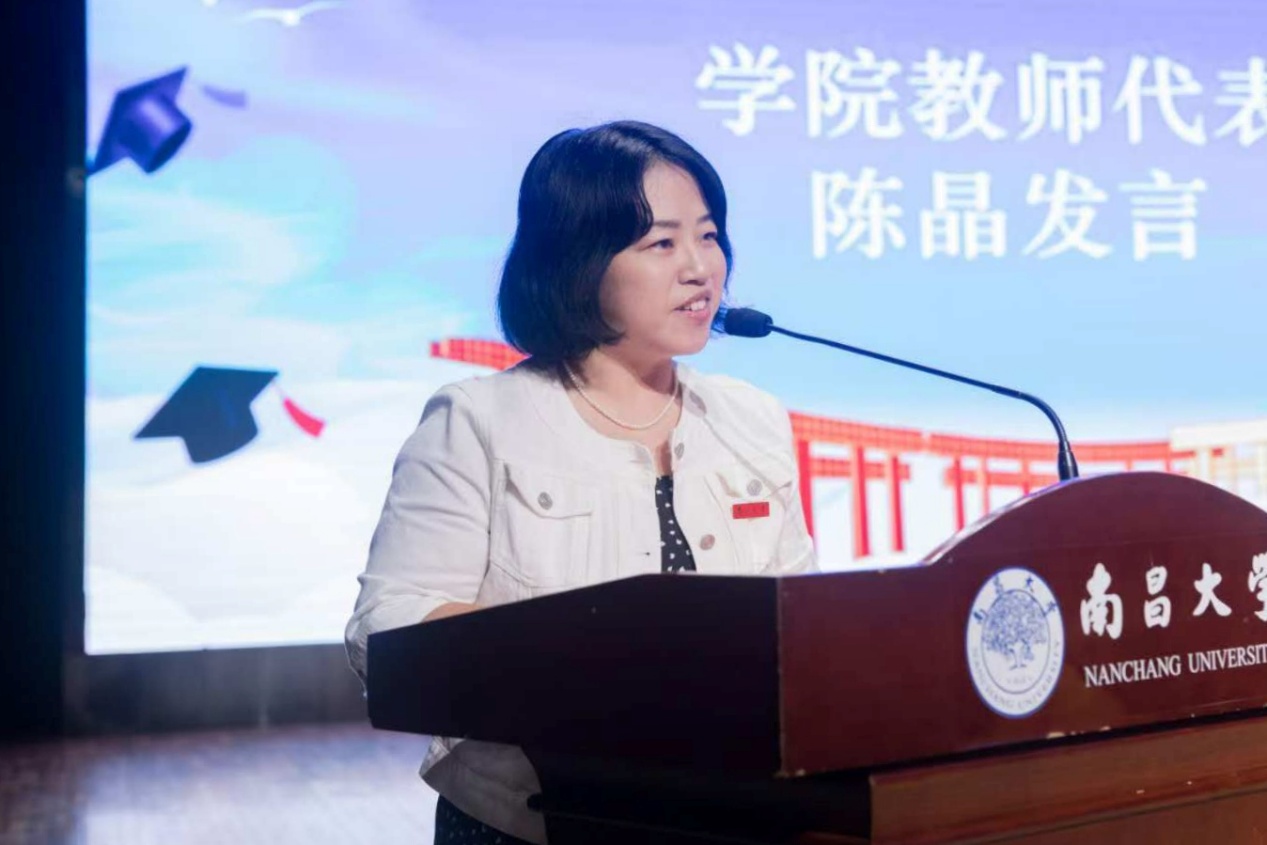 教师代表法语专业陈晶老师向全体毕业生致以热烈祝贺。她回顾了同学们在不同语种学习中的独特收获:在英语文本中剖析社会万象,透过法语文学领悟存在与抗争,借由日语表达感受含蓄之美,通过德语哲学思考生命真谛,在西班牙语世界中体验理想与现实的和弦,从俄语经典里理解历史叙事的壮阔。她指出,语言是连接世界的纽带,希望毕业生们带着国际视野勇敢前行,无论投身国际商务、外交还是文化交流,都应铭记语言是理解他者、构建人类命运共同体的基石。面对未来挑战,她勉励大家保持乐观,坚守道德,终身学习,并以塞缪尔·约翰逊的名言共勉:“不断奋斗,不断追求,不断探索,永不屈服。”
