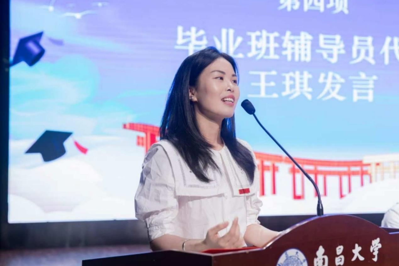 辅导员代表王琪老师饱含深情回顾了2025届本科毕业生四年的成长点滴。她细数那些镌刻在记忆中的温暖片段:外经楼的晨读、综艺大赛的精彩、深夜赶论文的坚持,这些都已成为最珍贵的青春印记。面对即将远行的学子,王琪老师送上三点殷切嘱托:一是保持语言的温度,即使不再从事外语工作,也要用语言倾听多元声音;二是拥抱不确定性,在变化中找到坚定;三是守护内心的浪漫,在现实社会中不忘仰望星空。无论你们走多远,外国语学院永远是你们的家。王琪老师最后深情寄语,“毕业快乐,永远快乐!”