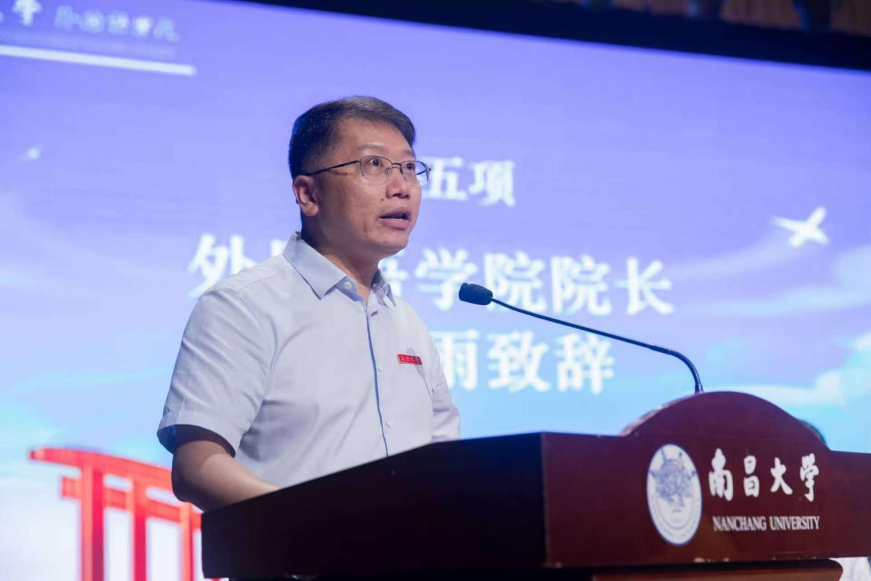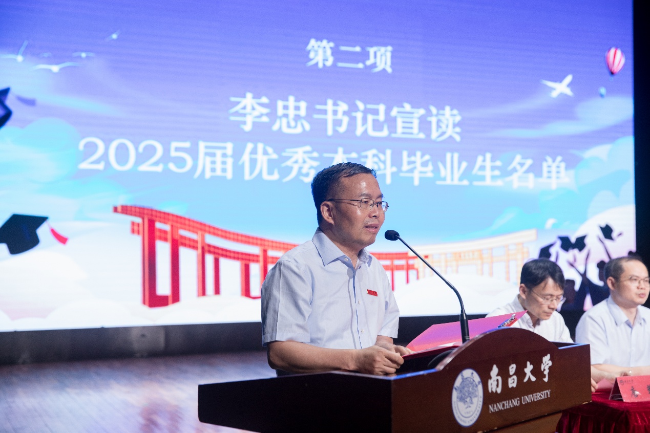 典礼伊始,院党委书记李忠宣读了2025届优秀本科毕业生表彰决定并向26名荣获优秀毕业生称号的同学表示衷心祝贺。他在讲话中充分肯定了毕业生们的优秀表现,勉励大家牢记南昌大学爱国、自强、创新、唯实的精神,在新的学习工作岗位上继续发扬外院学子的优良品格。他特别指出,作为新时代外语人才,同学们要坚定理想信念,将个人发展融入国家建设大局,在促进中外文明交流互鉴中展现青春担当。