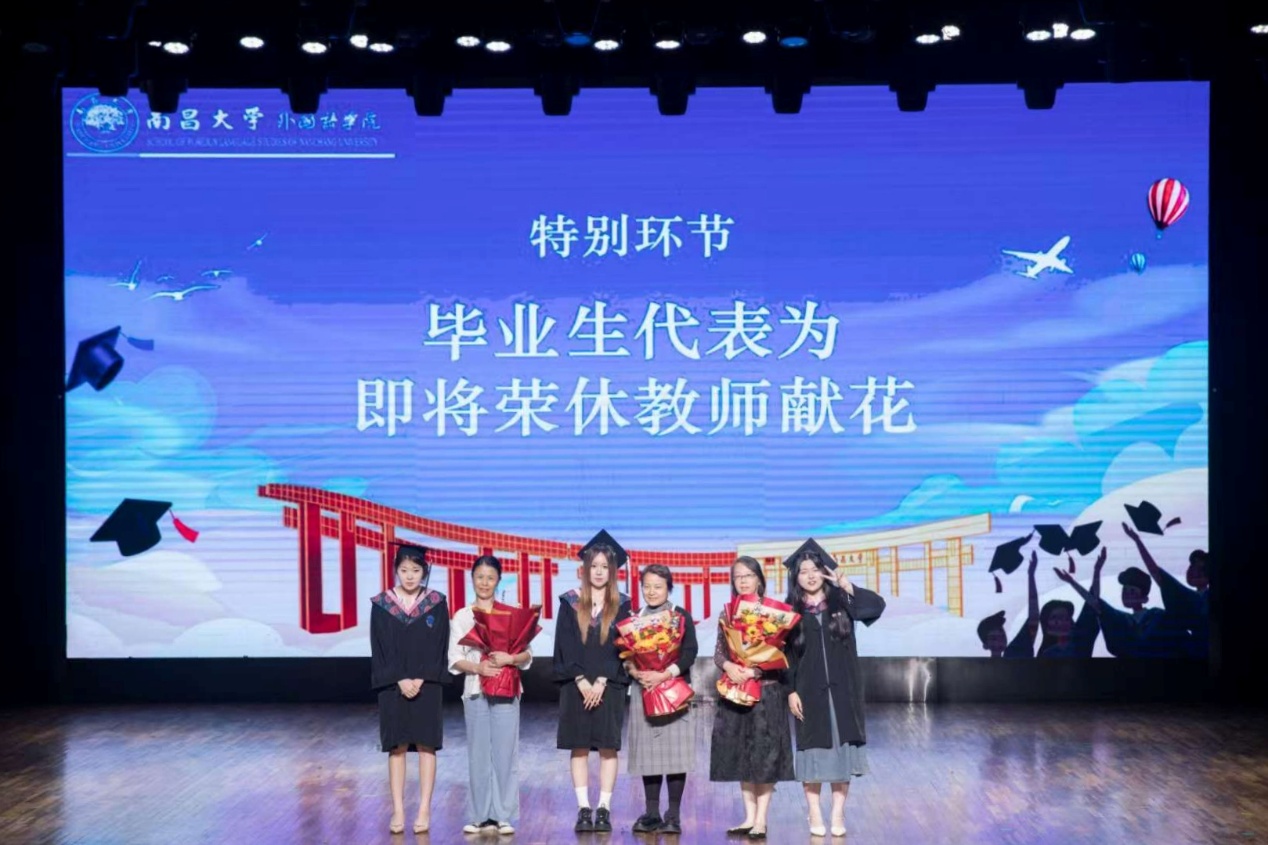 本次毕业典礼还特别设置了一个充满温情的环节:由2025届毕业生代表向即将荣休的宋庆丽叶向群汪海燕三位老师献上鲜花表达敬意。每一束鲜花都承载着全体毕业生对恩师的深深感激,也寄托着学院对荣休教师们退休生活的美好祝福。