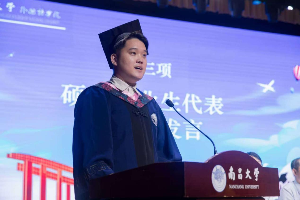 研究生毕业生代表刘禧亮同学以真挚的语言分享了自己的专业成长故事。作为“外研社·国才杯”“理解当代中国”全国大学生外语能力大赛英语组口译赛项国赛银奖获得者,他生动回忆了初学口译时的磕磕绊绊、词不达意,到如今能够在中英双语间自如转换的蜕变过程。刘禧亮同学深情地说道:语言不仅是交流的工具,更是文明的载体。作为外语人,我们肩负着讲好中国故事,传播好中国声音的使命。 面对人工智能对语言服务行业带来的变革,刘禧亮同学展现出外院学子特有的理性与担当:AI的崛起不是翻译工作者的末日,而是我们重新定义专业价值的新起点。我相信只要不断学习,打磨专业能力和人文素养,我们一定能在新时代的浪潮中站稳脚步,持续发出属于人类译者最清晰、最特别的声音。